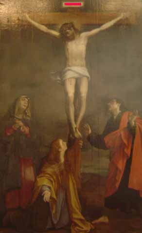 | Quel acronyme a été caché par un rectangle rouge au sommet de la croix, dans ce tableau de Bartolomeo Cesi ?