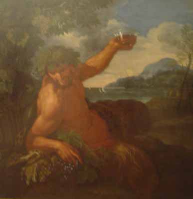 | Quel dieu rustique, assimilé au satyre chez les Grecs, est représenté buvant un verre de vin dans ce tableau du 17ème siècle ?